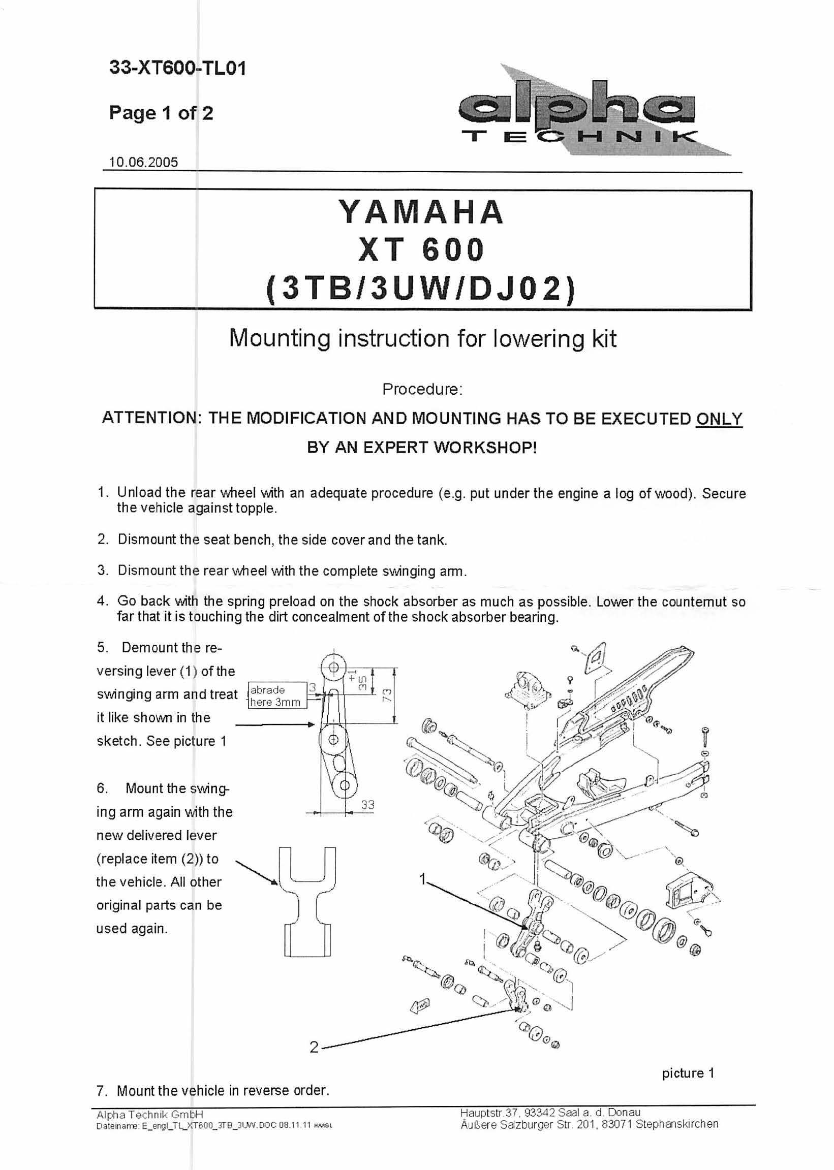 XT600 ’90–94 (3TB / 3UW / DJ02) Lowering Kit Installation Guide