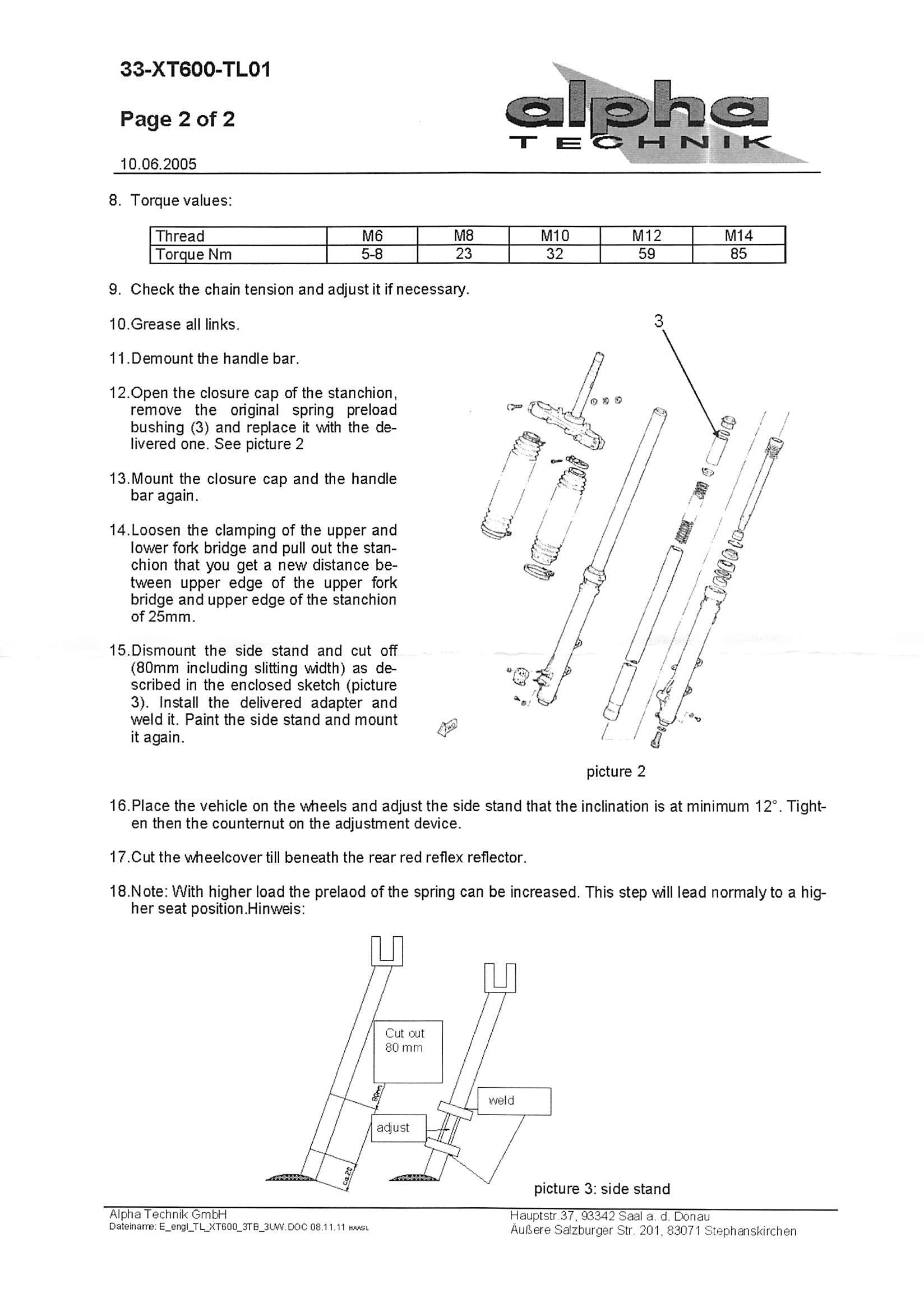 9 Shorten the side stand by 80 mm (including slit width) as per Picture 3. Install the supplied adapter, weld, paint, and reinstall.